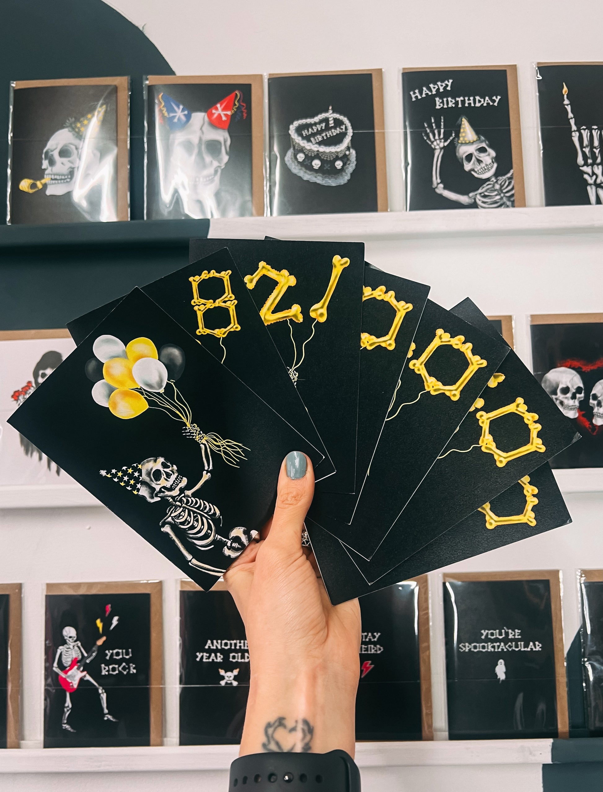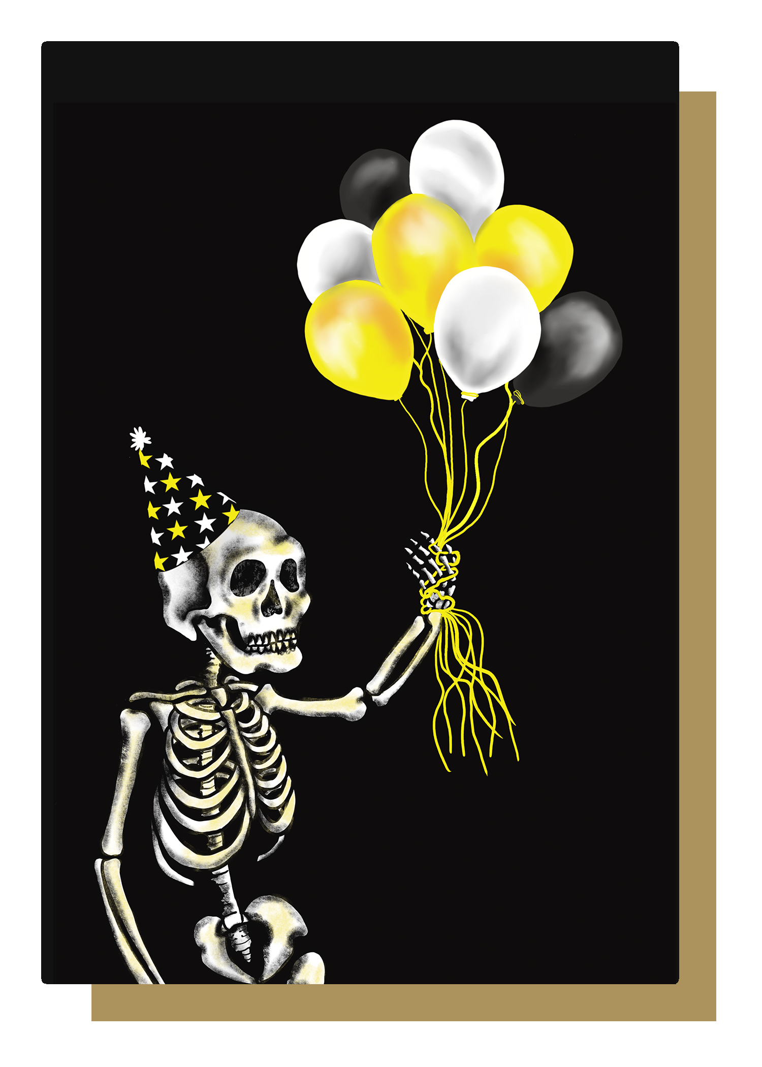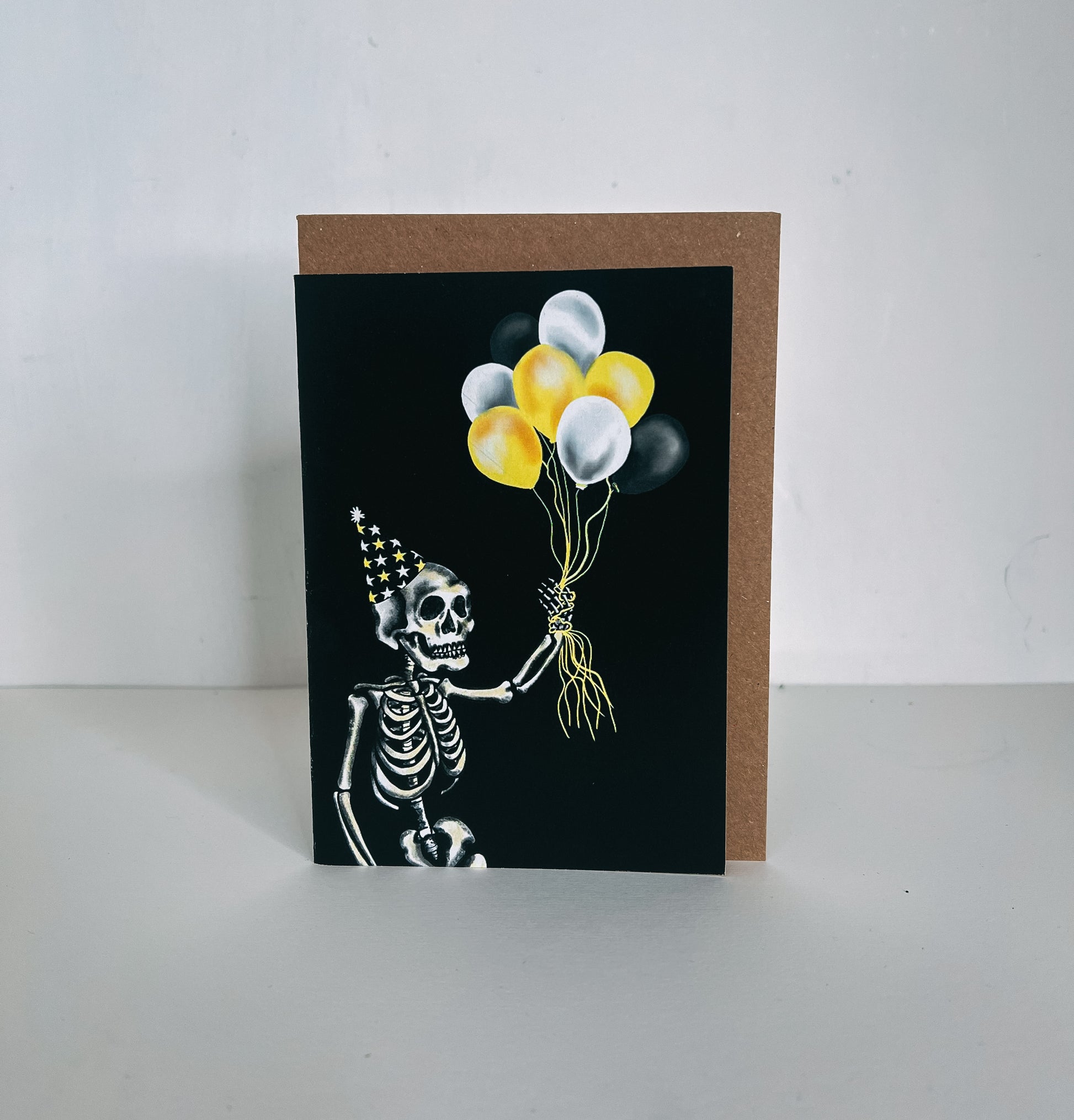 My Balloon skeleton is a super fun gothic greetings card and a unique way to say happy birthday