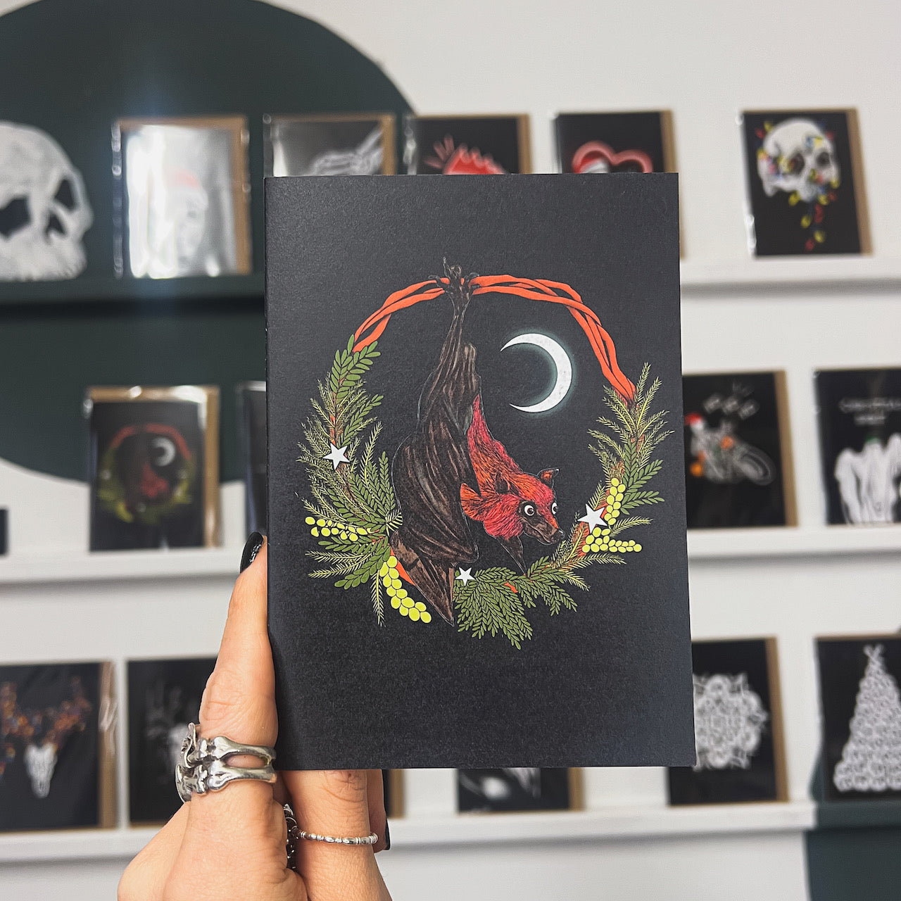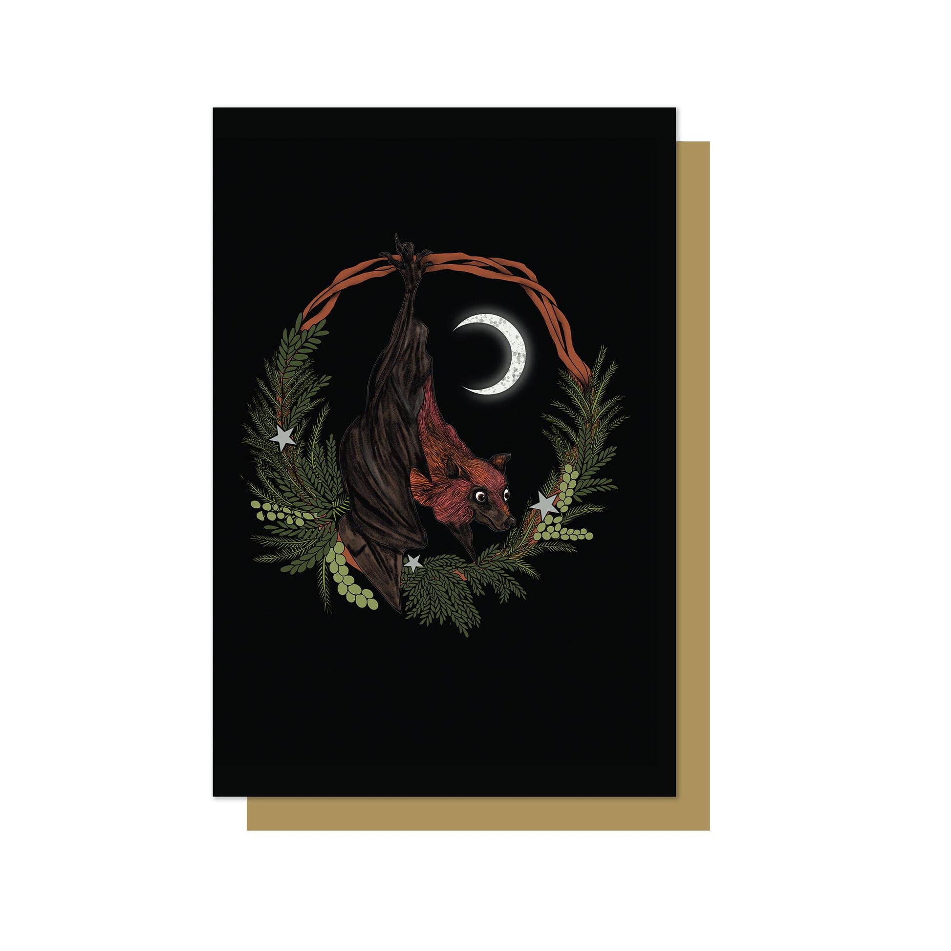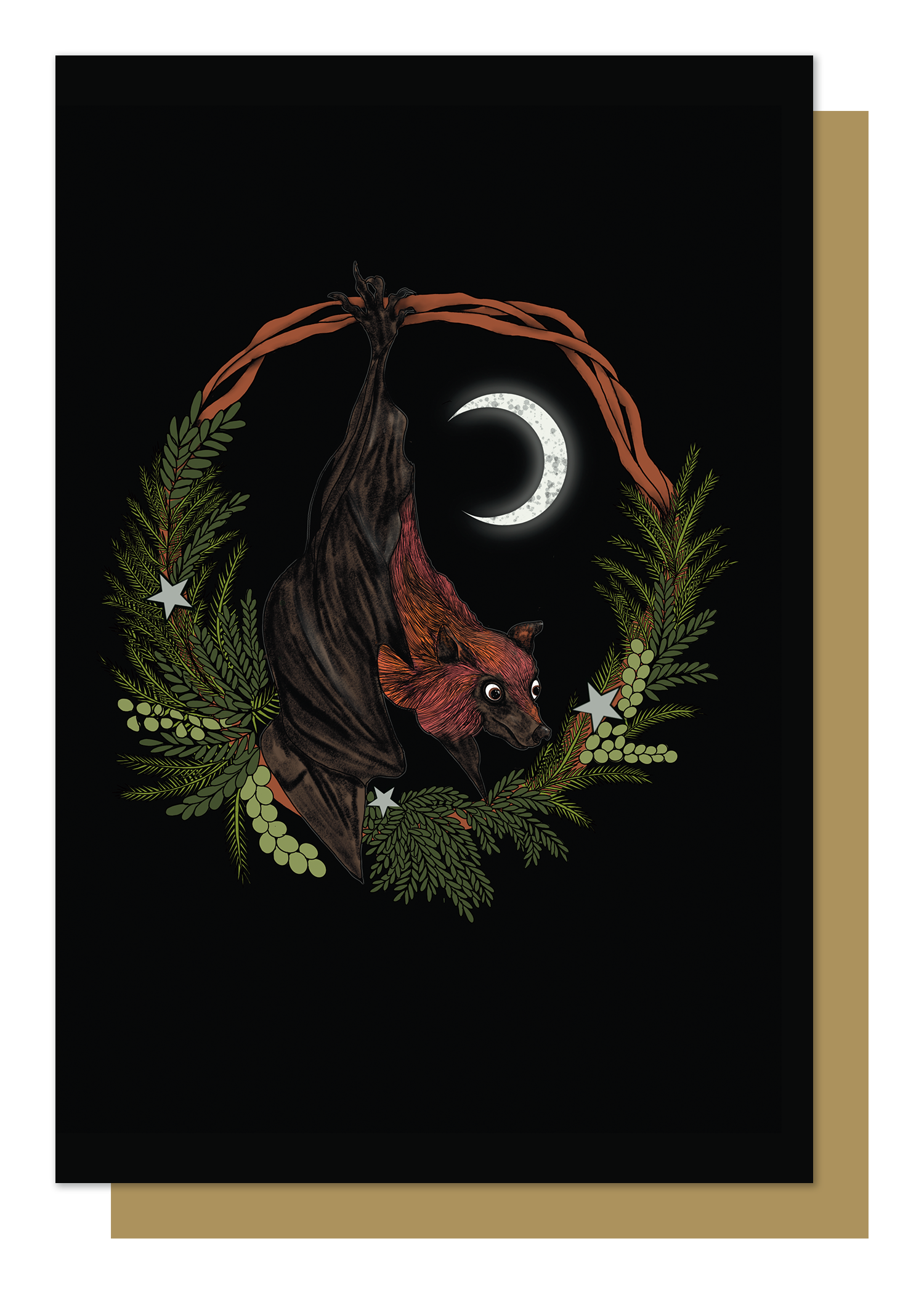 A holiday card celebrating nature with my cute bat illustration within a botanical wreath
