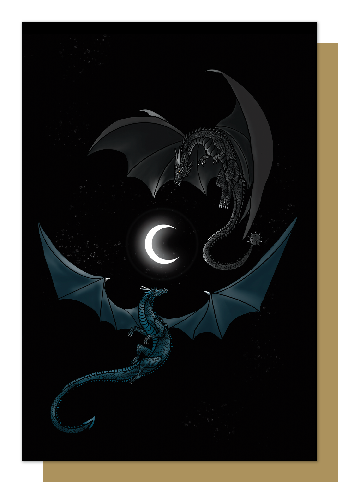 A couple of dragons having a romantic meeting by the moon. A lovely card for fantasy lovers. For valentines, anniversary, wedding or any occasion.