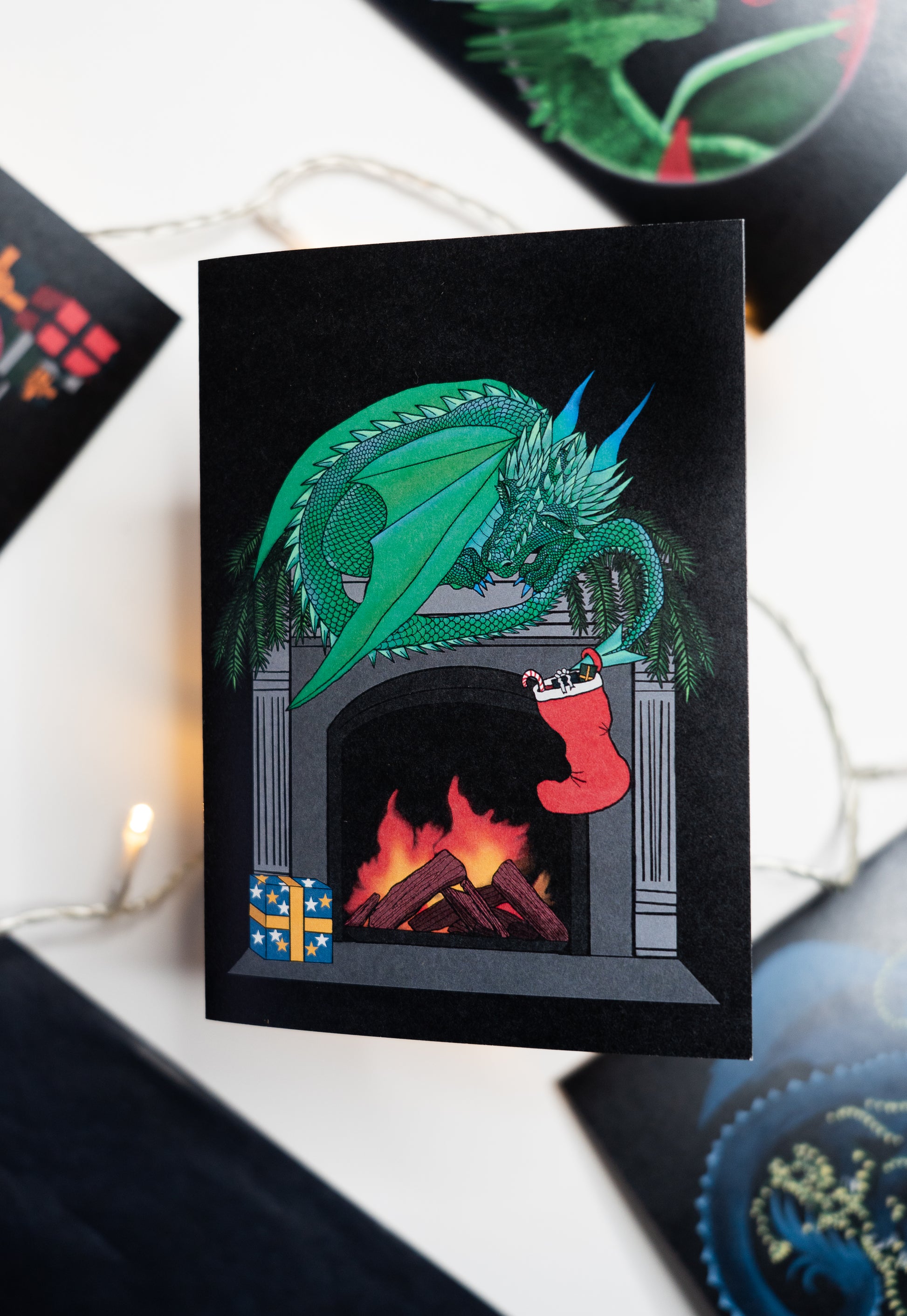 My sleepy little dragon has fallen asleep in the warmth of he fire while waiting for Santa. A super cute Christmas card for fantasy lovers