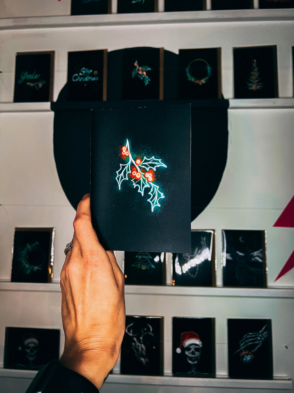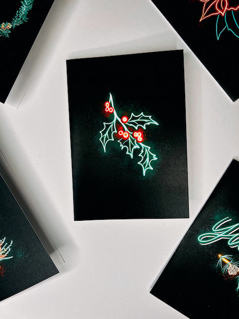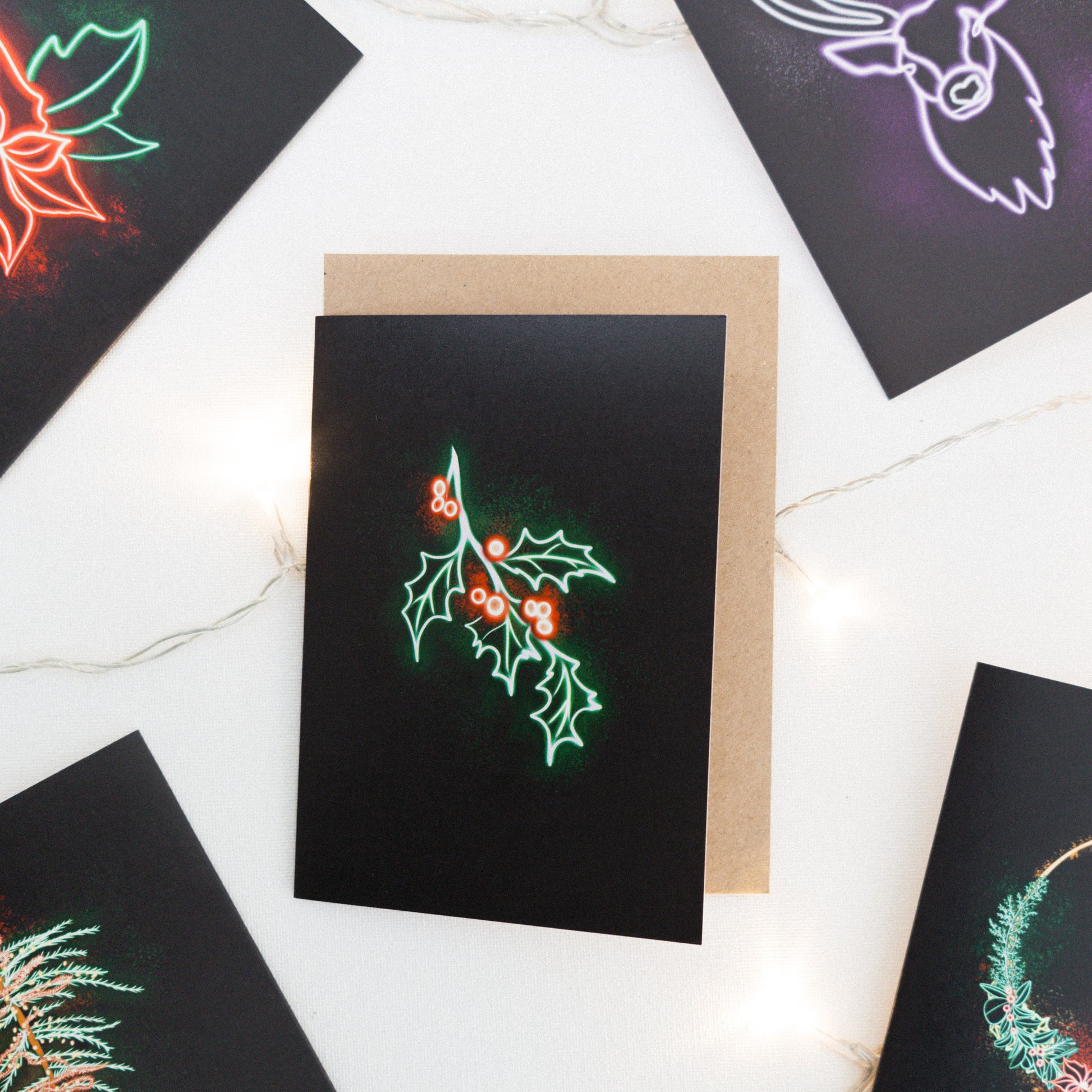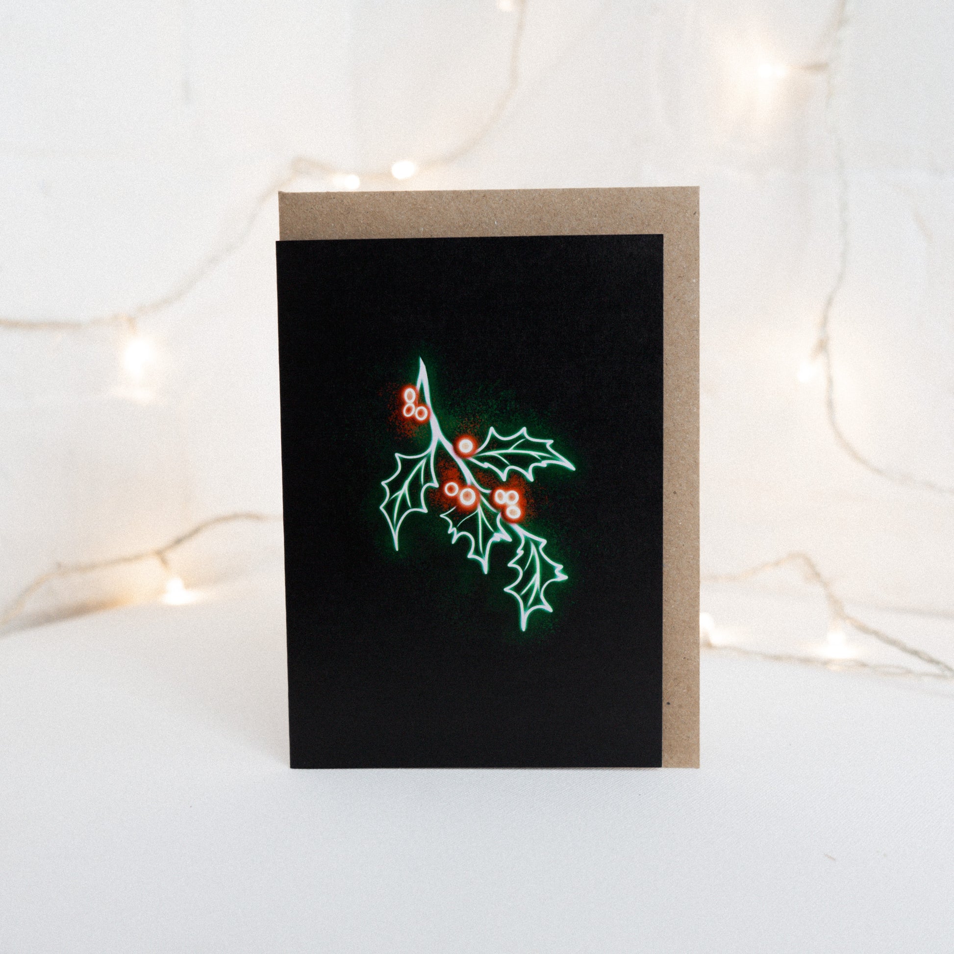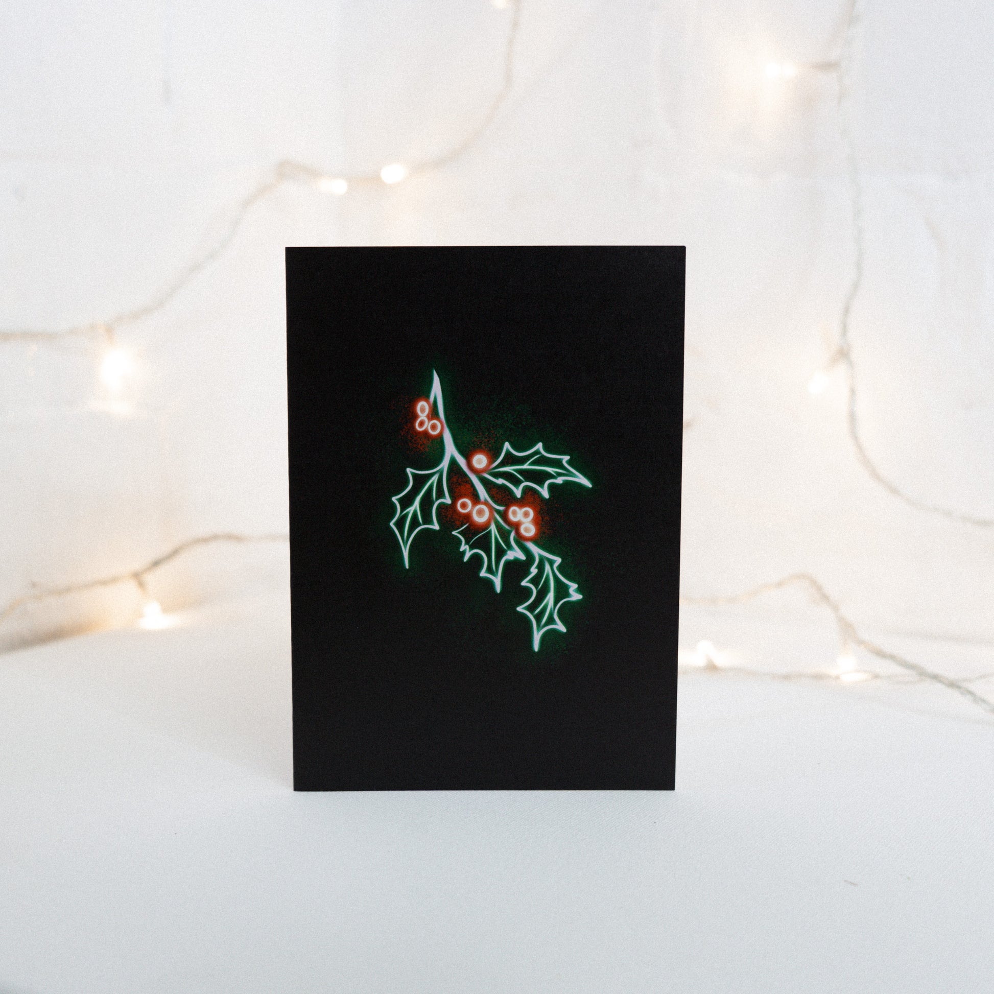 Holly neon alternative Christmas card that rocks. A classic seasonal symbol with a neon glow up