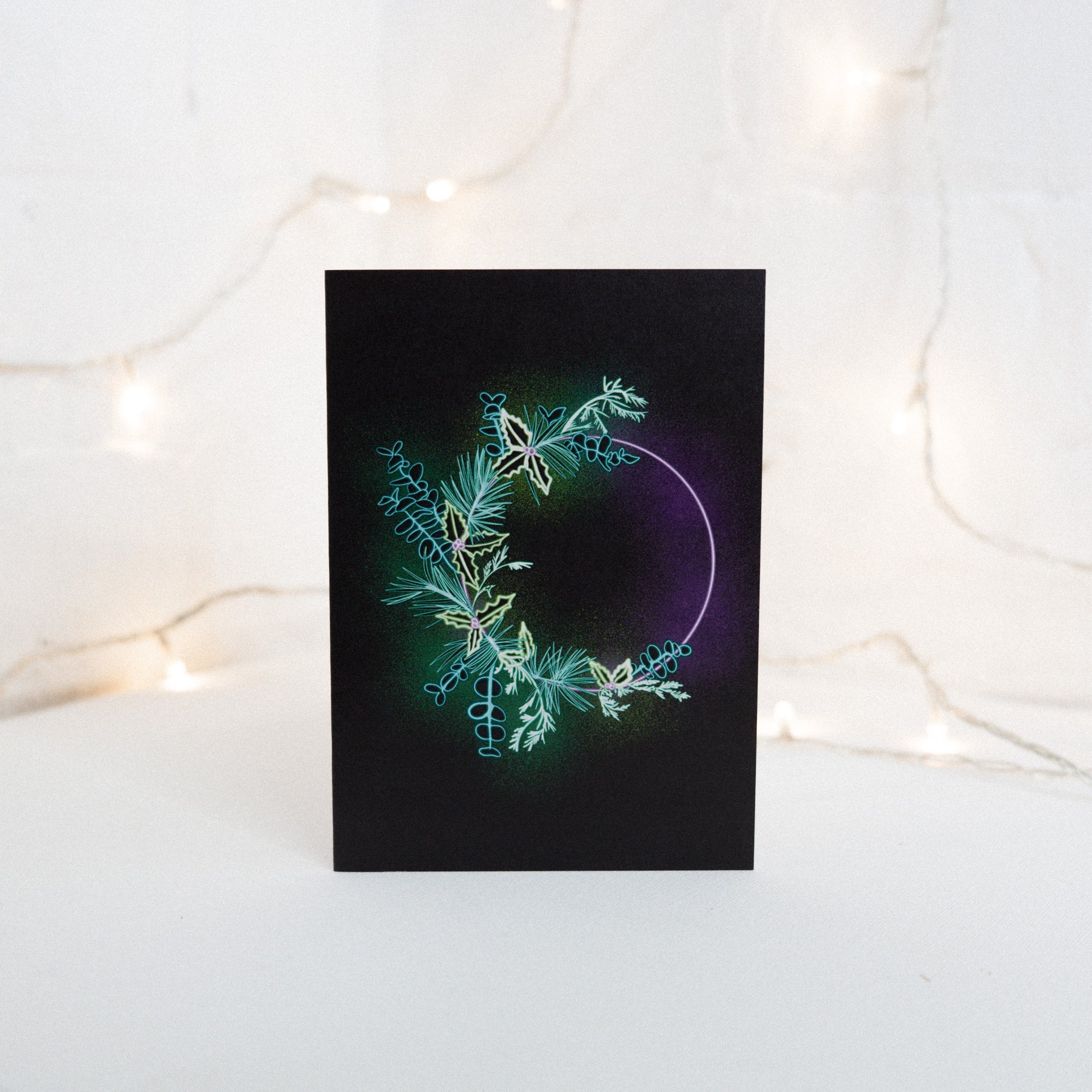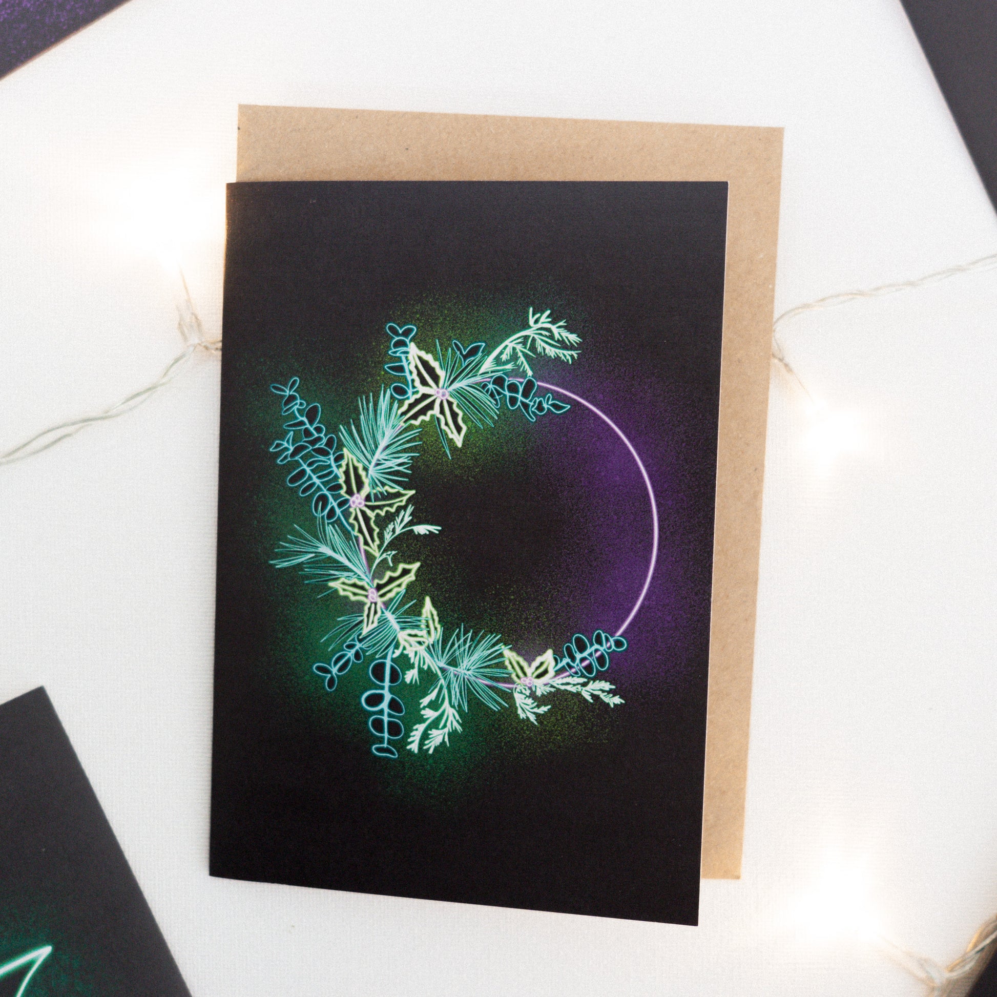 An alternative Christmas card brightening up a traditional wreath with a neon illustration to add a little rock and roll to this years seasons greetings