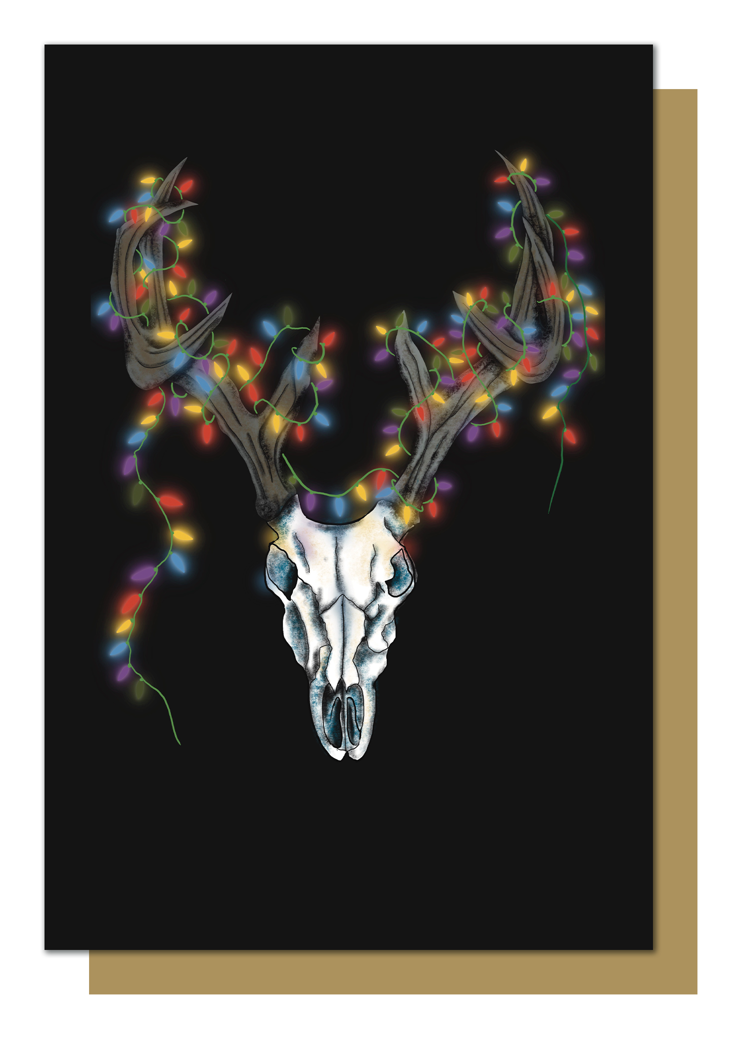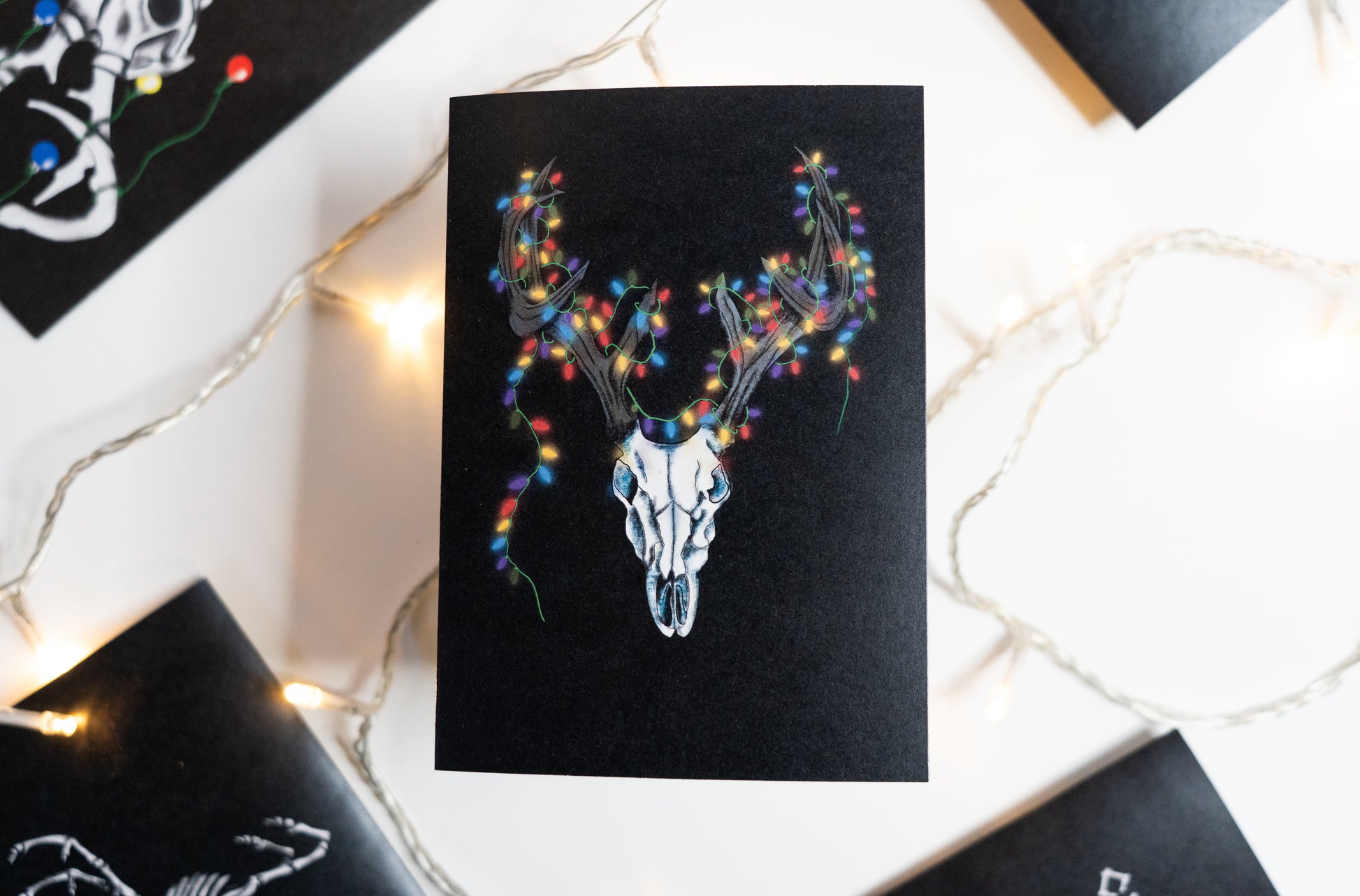 An update of my best selling reindeer with lights greetings card is fun gothic Christmas card to send to your favourite alternative friend or family member