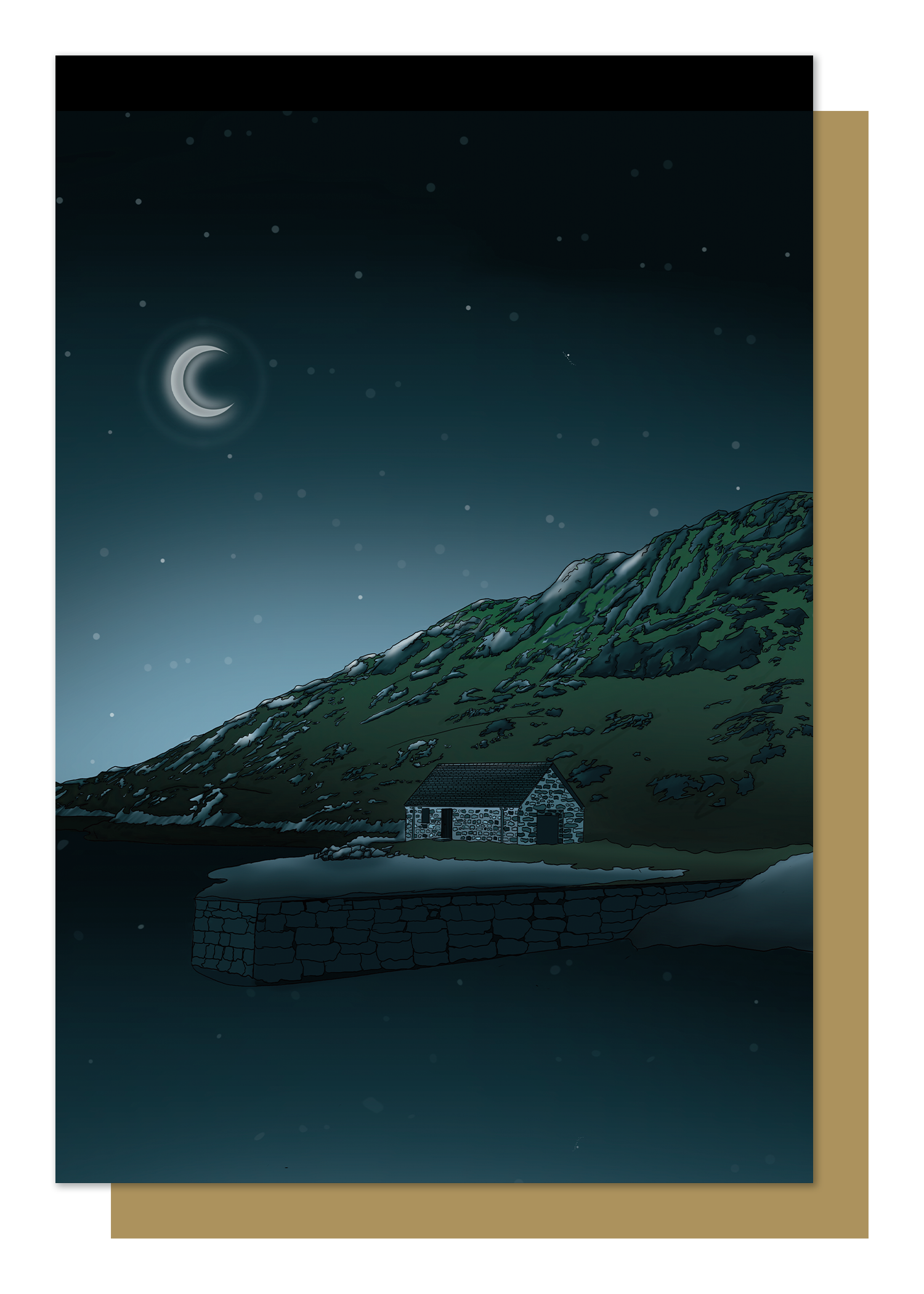 An illustration of a North Coast 500 Scotland Bothy under the light of the moon