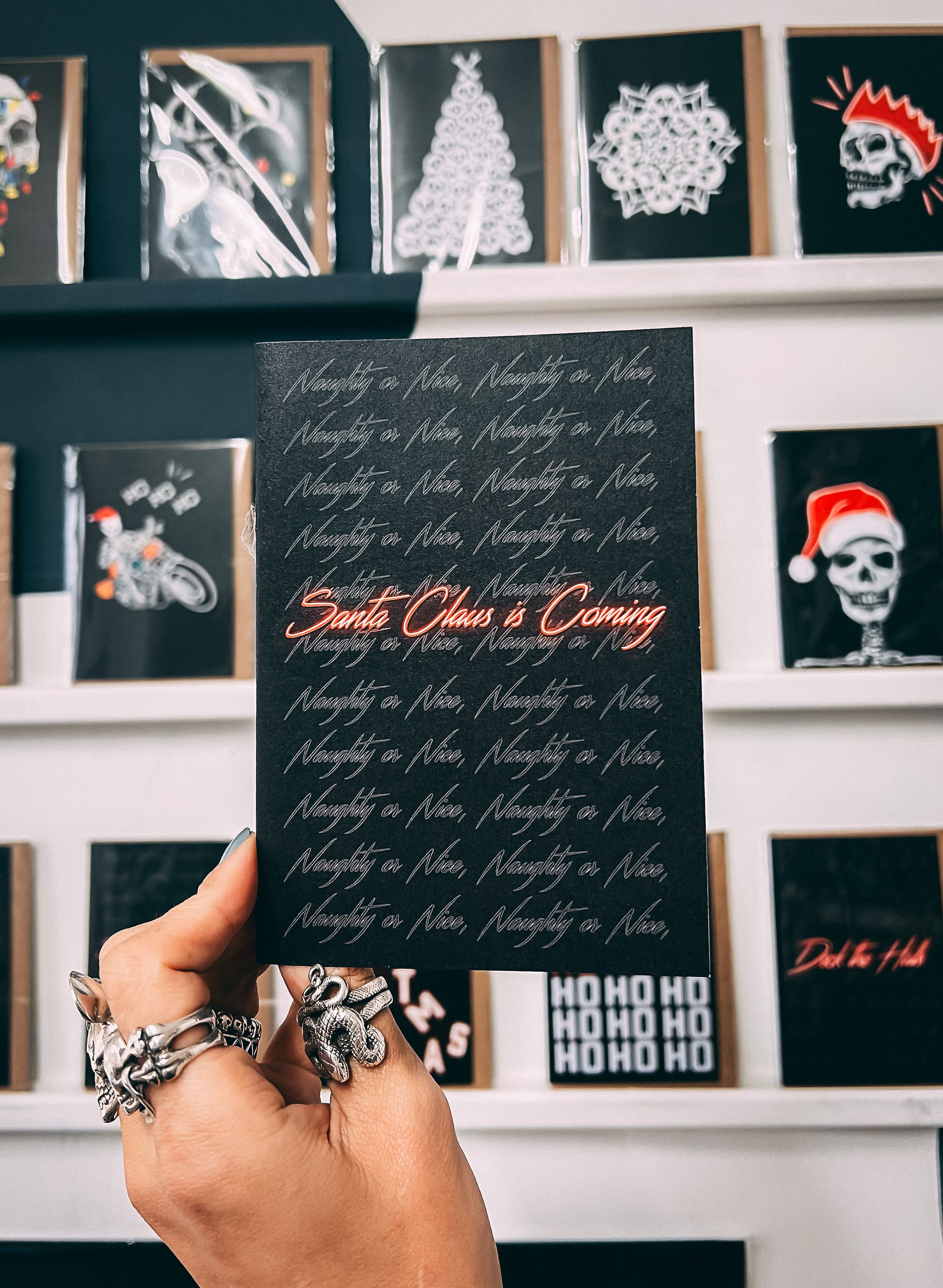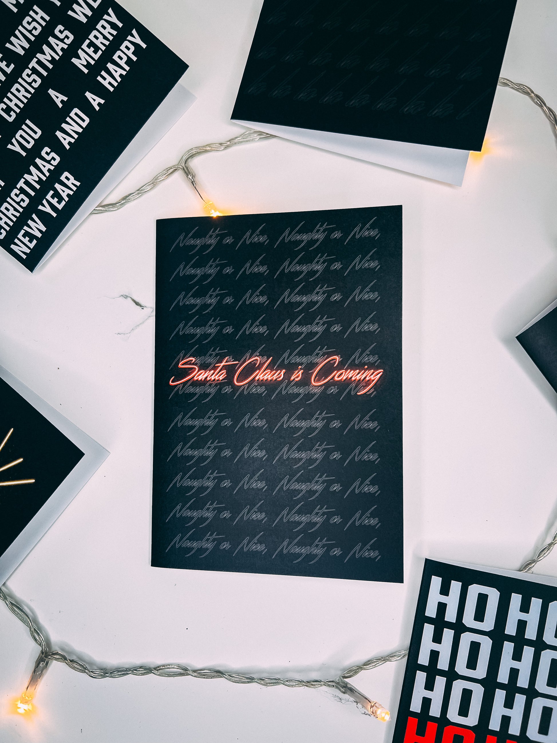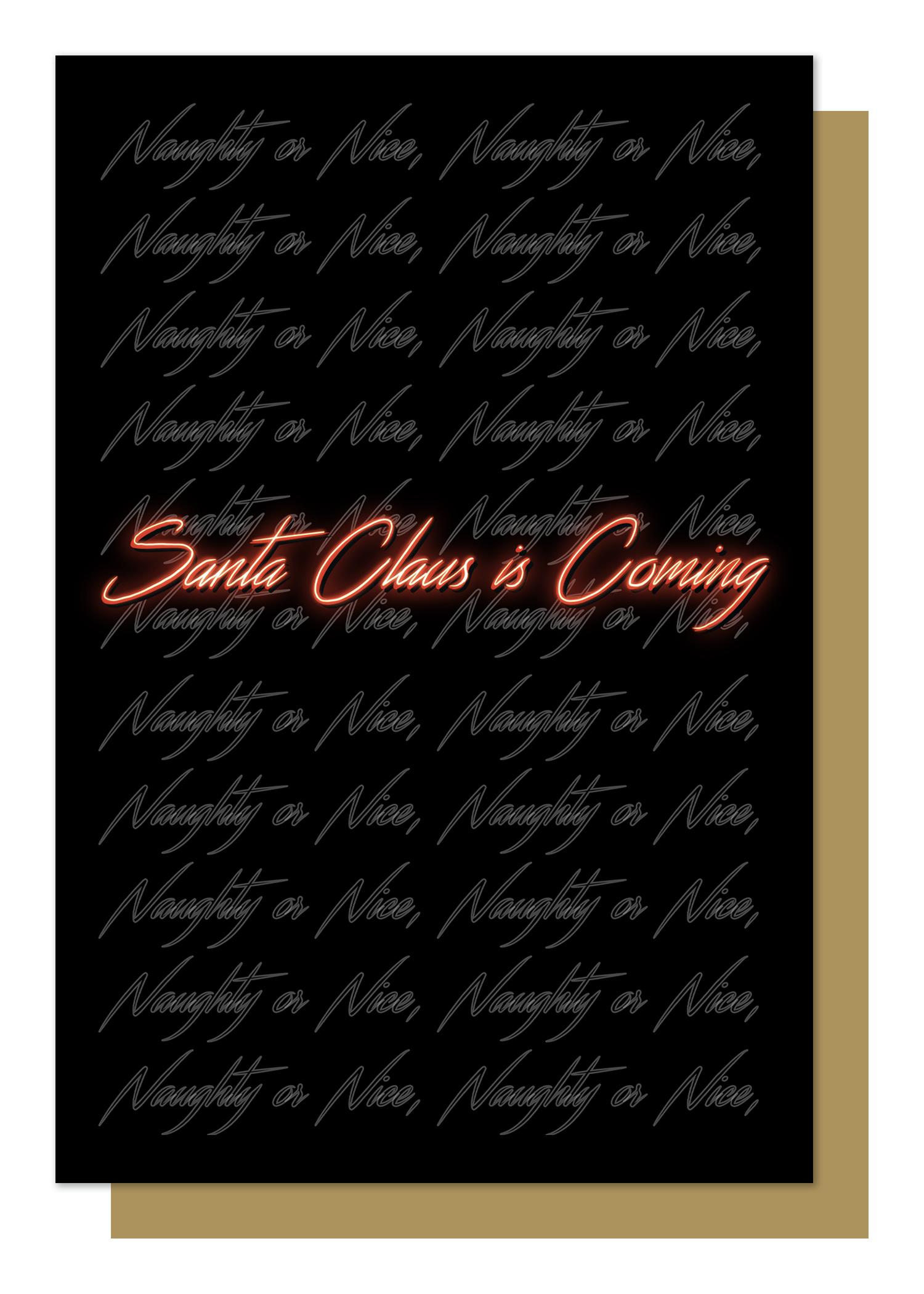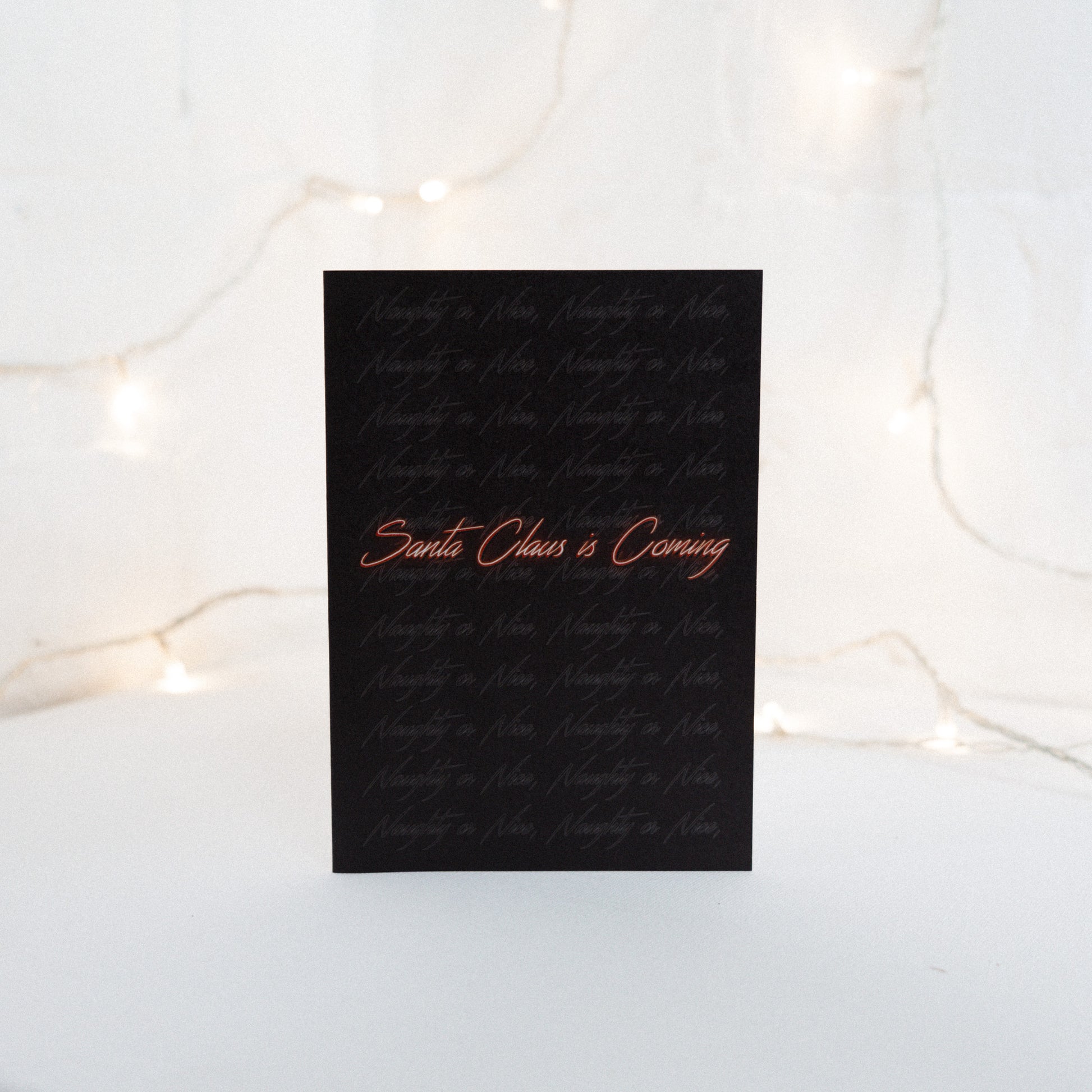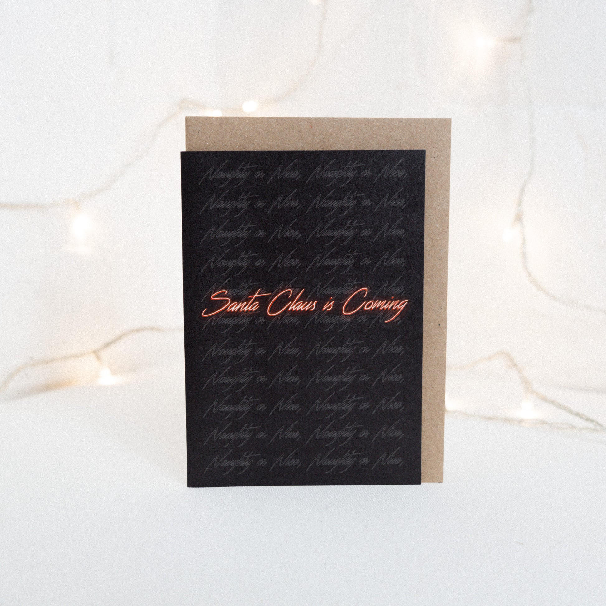 Santa Claus Is Coming Neon Christmas Card A fun neon take on a holiday classic