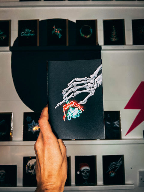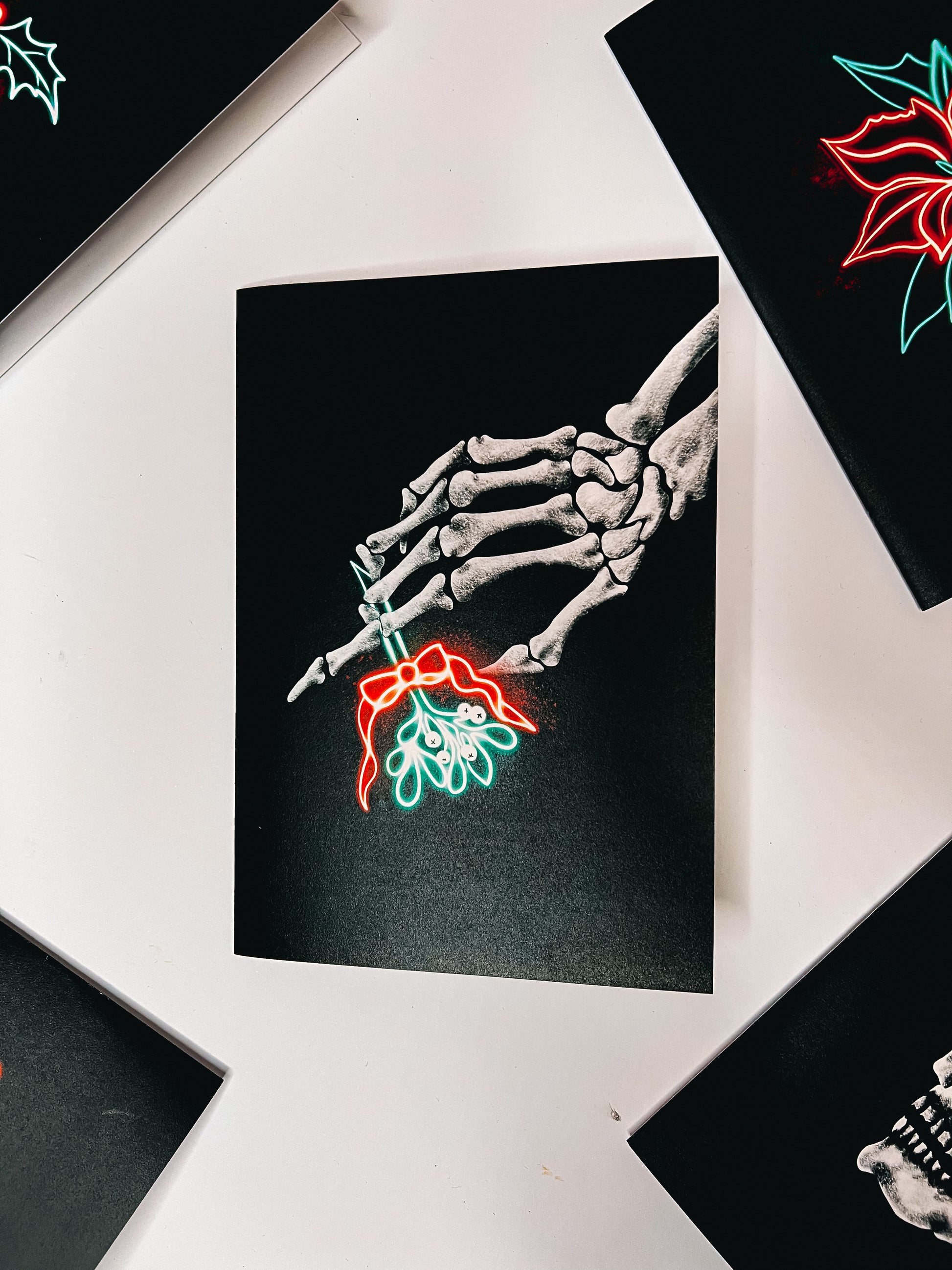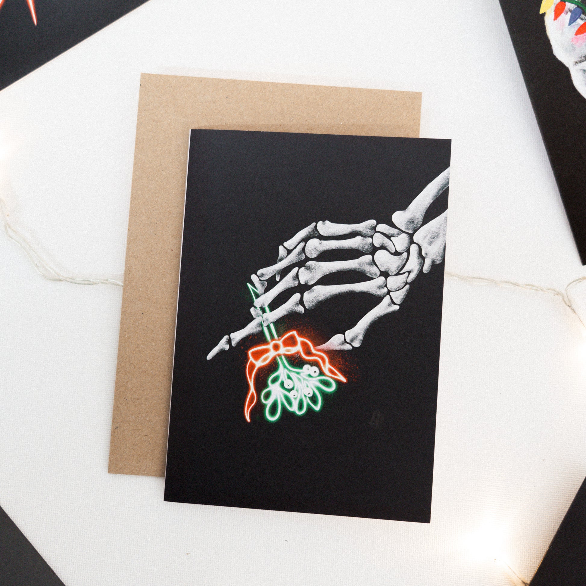 Skeleton With Neon Mistletoe Christmas Card a fun gothic take on Christmas greetings