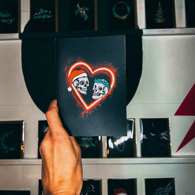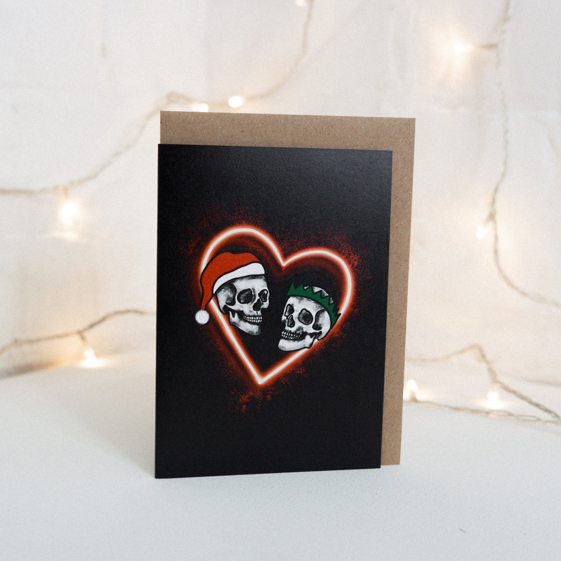 Skull Christmas Couple Neon Card a fun gothic take on Christmas greetings perfect for those alternative people in your life.