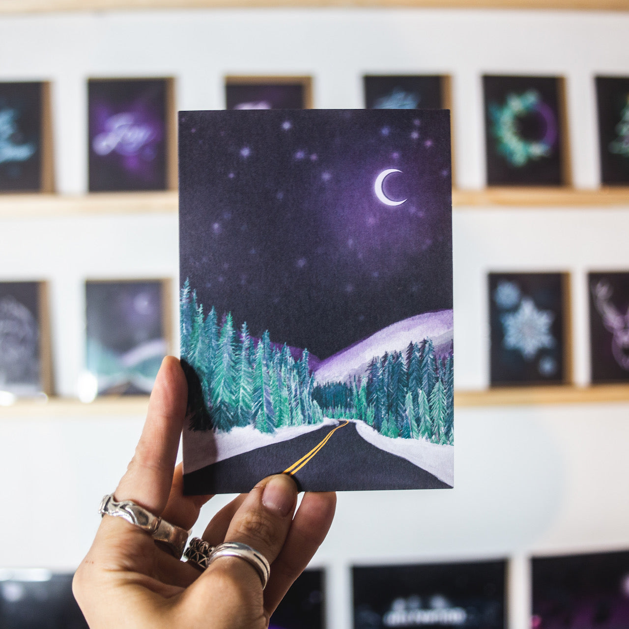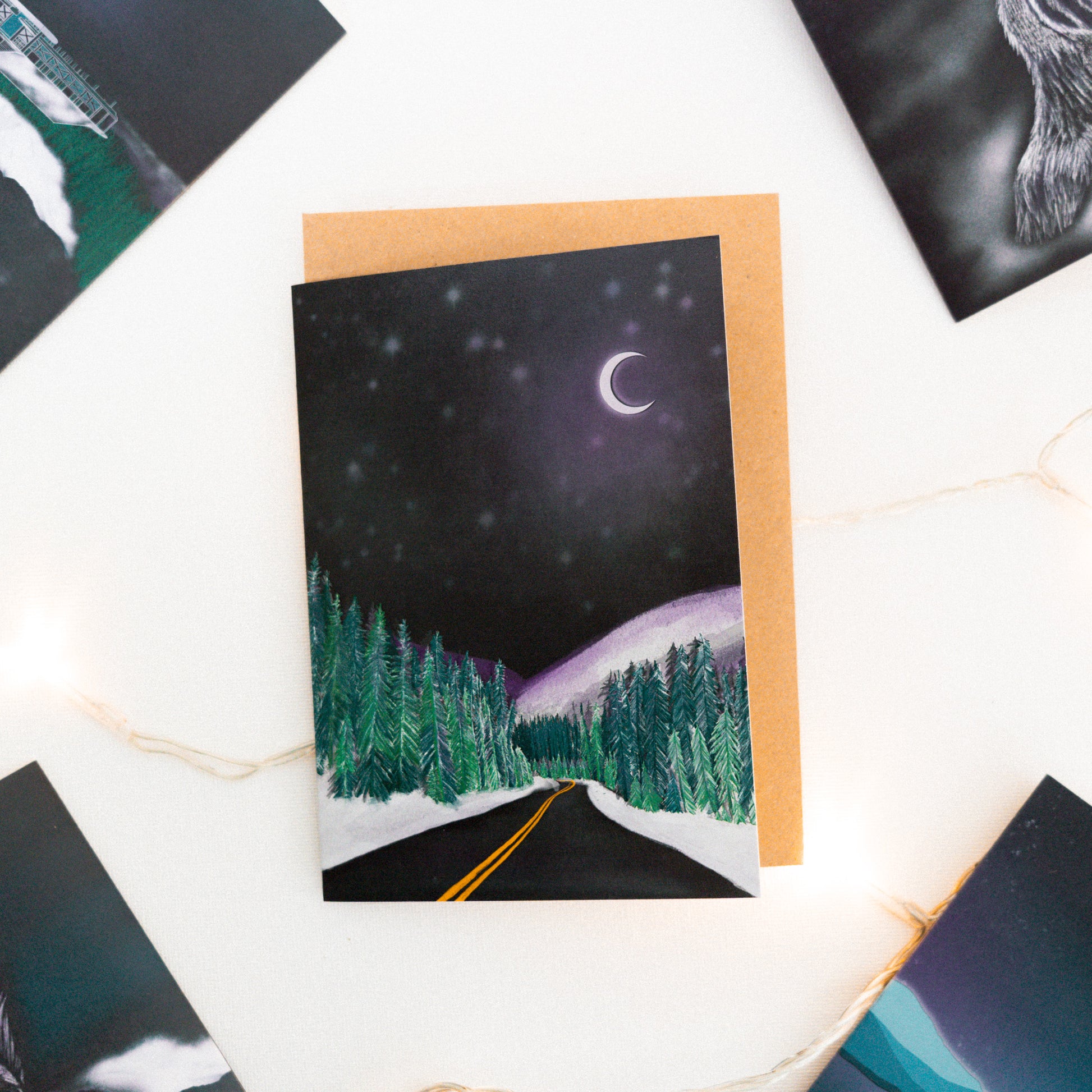 A series of cards celebrating the natural beauty of winter. Inspired by my travels and love of the outdoors this mountain scene is inspired by road tripping through Canada.